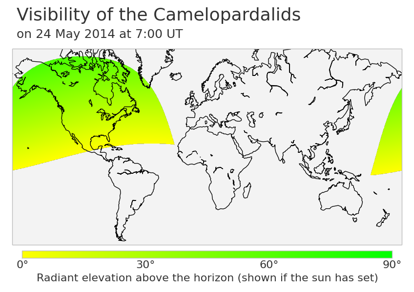 Op onderstaande afbeelding. (Dank Geert Barentsen!) Is te zien waar op Aarde de meteorenstorm mogelijk zichtbaar is. Het hoogtepunt wordt verwacht om 09.00 uur in de ochtend, in Nederland is het dan al lang licht. Zoals je ziet valt Europa en dus ook Nederland niet binnen de zone waar de kans het meest waarschijnlijk is. Echter niets is zeker in het leven, dus heb je zin en tijd zoek dan een donker plekje op! De grootste kans is zaterdagochtend enkele uren voor zonsopkomst. (en die is al om 05.42 uur!). Wie weet pak je er nog iets van mee…maar niet teleurgesteld zijn als er uiteindelijk toch niets te zien is!