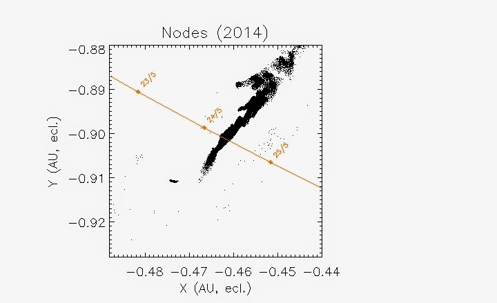 Afbeelding waarop de baan van de aarde is te zien en enkele posities van de Aarde op 23-24 en 25 mei. De zwarte plek is de stofwolk die de Aarde passeert en die de meteorenstorm veroorzaakt.