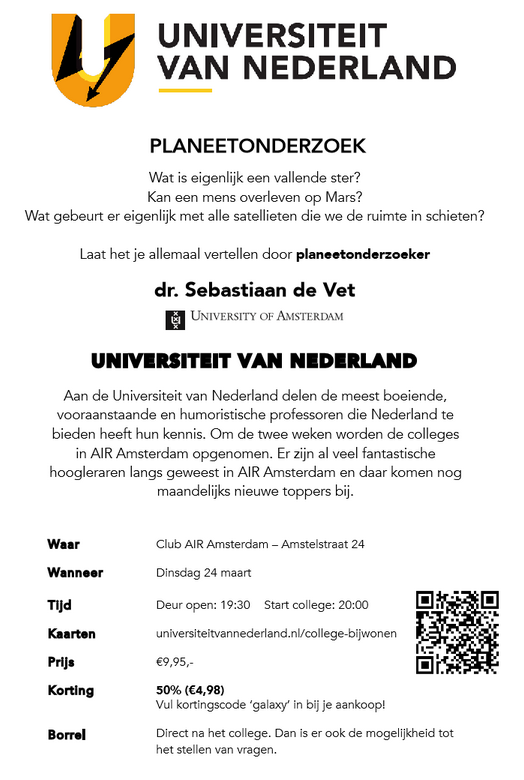 Werkgroeplid, Sebastiaan de Vet, zal op 24 maart op de UvA in Amsterdam een gastcollege geven waarin allerlei vraagstukken rondom planeetonderzoek centraal staan. Hoe komt het dat onze aarde steeds zwaarder wordt? Hoe maak je in een handomdraai een komeet? Waarom is de aarde een ideale vuilverbrandingsoven? Kunnen we leven op Mars? Ook zal hij het hebben over meteoren en waar in de geschiedenis er in Nederland meteorieten zijn neergekomen.