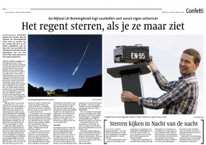 Jos Nijland heeft al jaren een all-sky-camera in zijn tuin waarmee hij regelmatig mooie vuurbollen vastlegd. Onlangs verscheen een artikel over Jos in het Noordhollands Dagblad. U kunt het artikel hier downloaden: Vuurbollen
