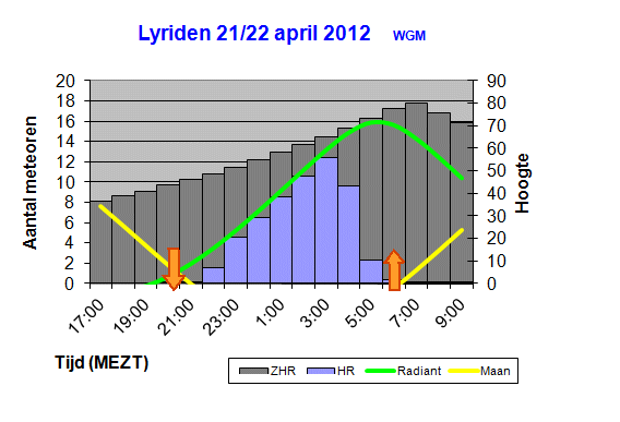 De Lyriden zijn deze nacht bij helder weer het best te bekijken. Het maximum valt in de ochtend van 22 april rond 7 uur. De radiant komt in de loop van de nacht steeds hoger, waardoor er in de nanacht onder gunstige omstandigheden zo’n 10 meteoren per uur kunnen verschijnen. De maan is nieuw en stoort niet. Bekijk de zwerm na middernacht.