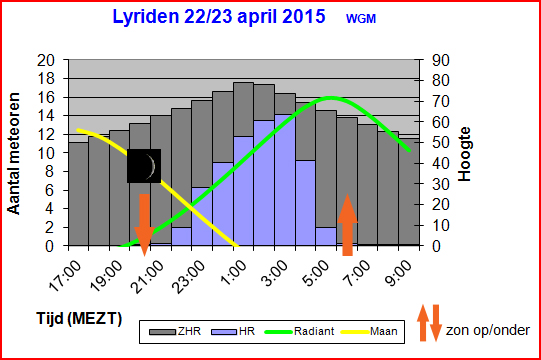 Om 2 uur ’s nachts (23 april) wordt het maximum van de Lyriden-meteorenzwerm verwacht. Als de sporen van de meteoren die bij deze zwerm behoren naar achteren worden verlengd, dan lijken ze uit het sterrenbeeld Lier te komen (zie vluchtpunt op de ronde sterrenkaart). De zwerm kan het beste tussen middernacht en de ochtendschemering worden bekeken. In de loop van de nacht zal sterrenbeeld Lier (en dus het vluchtpunt) steeds hoger aan de hemel klimmen waardoor het aantal meteoren bij een heldere en donkere hemel kan oplopen tot zo’n 15 per uur. Er is geen storend maanlicht.