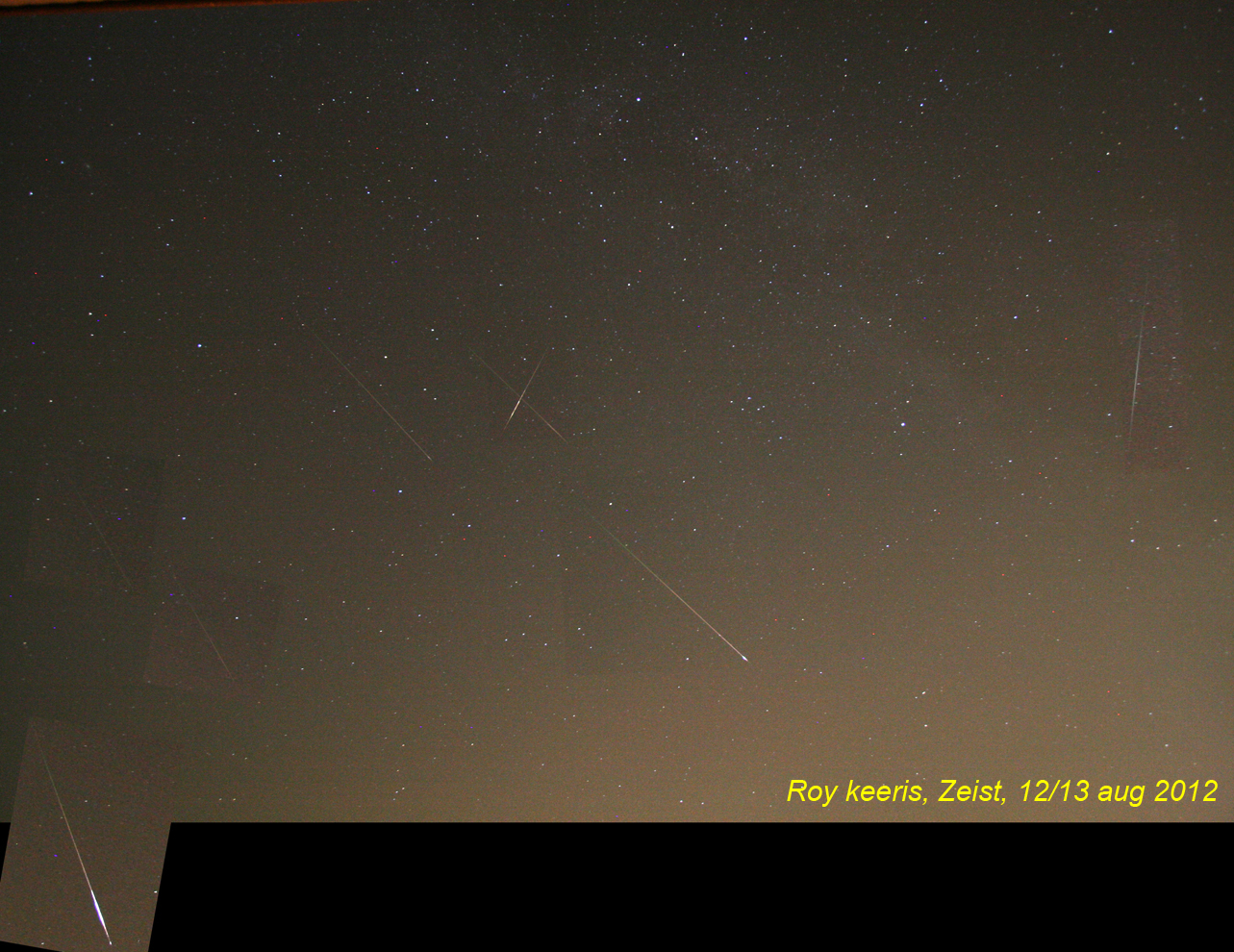 Ook de nacht van zondag 12 op maandag 13 augustus verliep in Nederland helder, waardoor er, net als de nacht ervoor, veel vallende sterren te zien waren. Bijgaand een collage van 8 vallende sterren gedurende deze nacht, gemaakt door Roy Keeris in Zeist. De foto toont 6 Perseïden, 1 kappa-Cynide en 1 sporadische meteoor. De Perseïden lijken uit de richting van het sterreneeld Perseus te komen (vanuit de hoek rechtsboven).