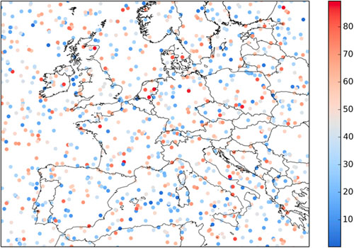 Overzichtskaart met de gesimuleerde inslaglocaties in West-Europa. De kleur weerspiegelt de hoek waaronder de inslag werd gesimuleerd; negentig graden is een verticale inslag. Bron: Rumpf, et al., 2017. Asteroid impact effects and their immediate hazards for human populations, Geophys. Res. Lett., 44, doi:10.1002/2017GL073191.